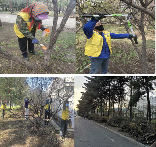 校园建设处同服务企业管理层多次踏查校园绿化现状,研究制定养护工作方案,指导企业做好养护人员疫情排查、岗前培训等工作;要求服务企业在约定时间节点科学、优质的完成学校春整园工作。截止至5月中旬,校园内榆紫金花虫防治、校园绿地杂物清理、校园灌木修剪等工作已接近尾声,共投入人力800余人次,外运垃圾、杂物及树木修剪物130余车。下一阶段校园绿化日常性养护工作将开展乔木修剪、病虫害防治、杨柳絮防控、古树复壮、座椅等基础设施粉刷等工作。
