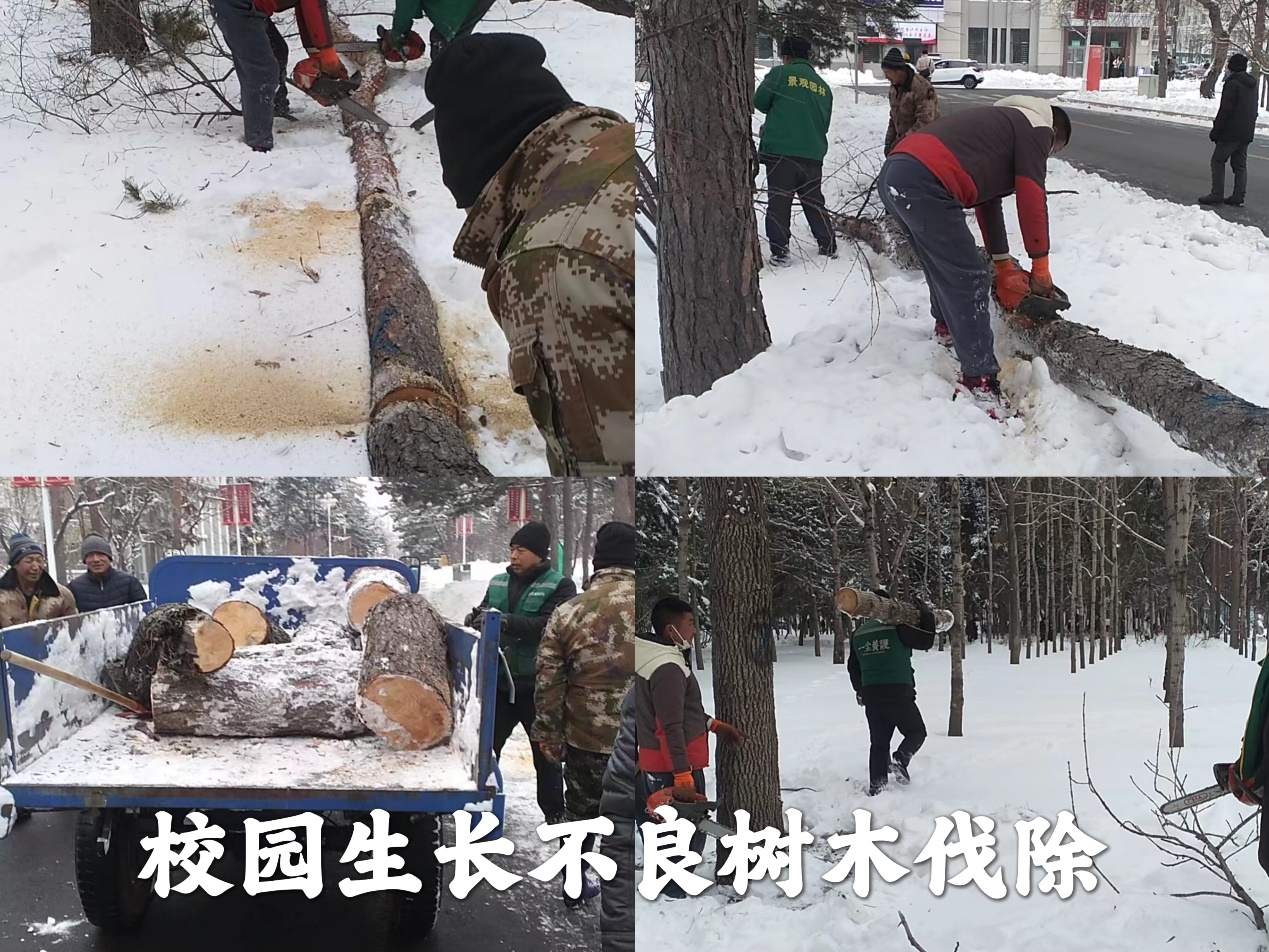 校区部分树木病害严重,存在影响师生安全问题,经报政府相关部门审批后,伐除了校园内30余株死亡及生长不良的树木。同时向省里汇报了学校潜在风险树木46株。