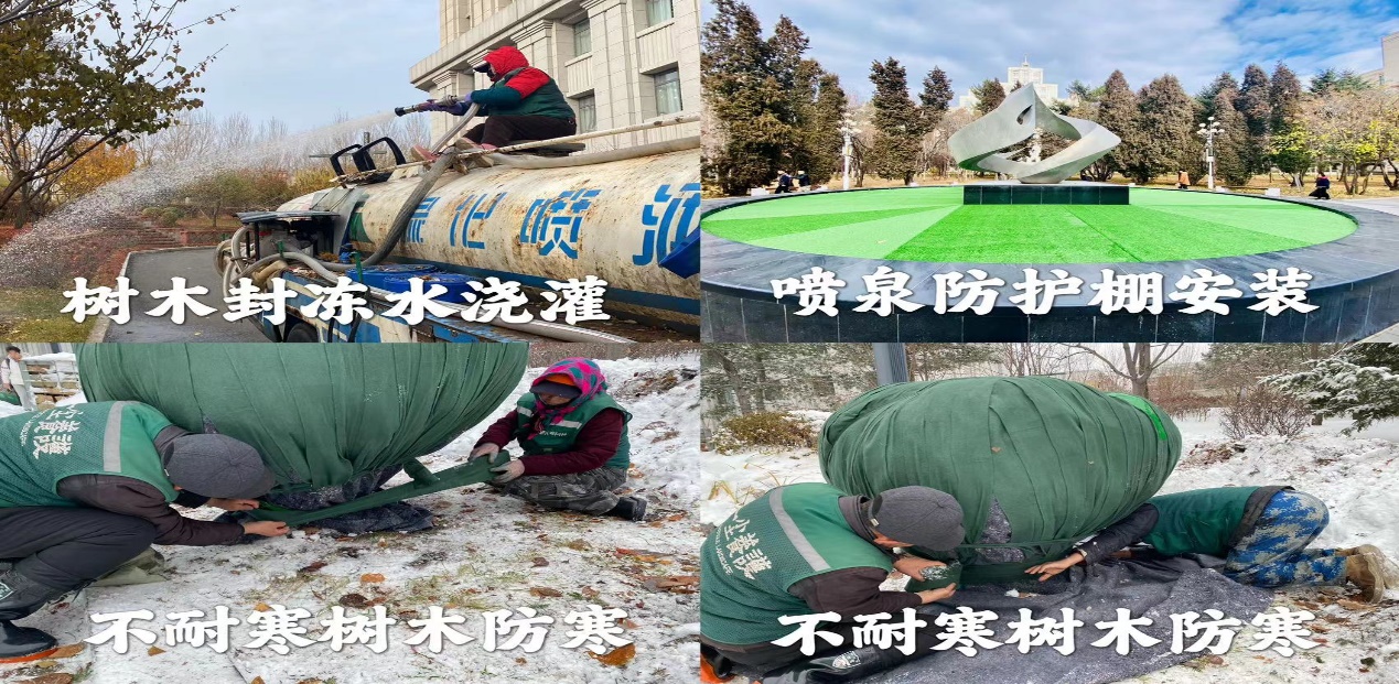 为喷泉广场的喷泉设施安装防护棚,为不耐寒树木捆绑防寒保暖外衣,为校区新植树木浇灌封冻水等工作。