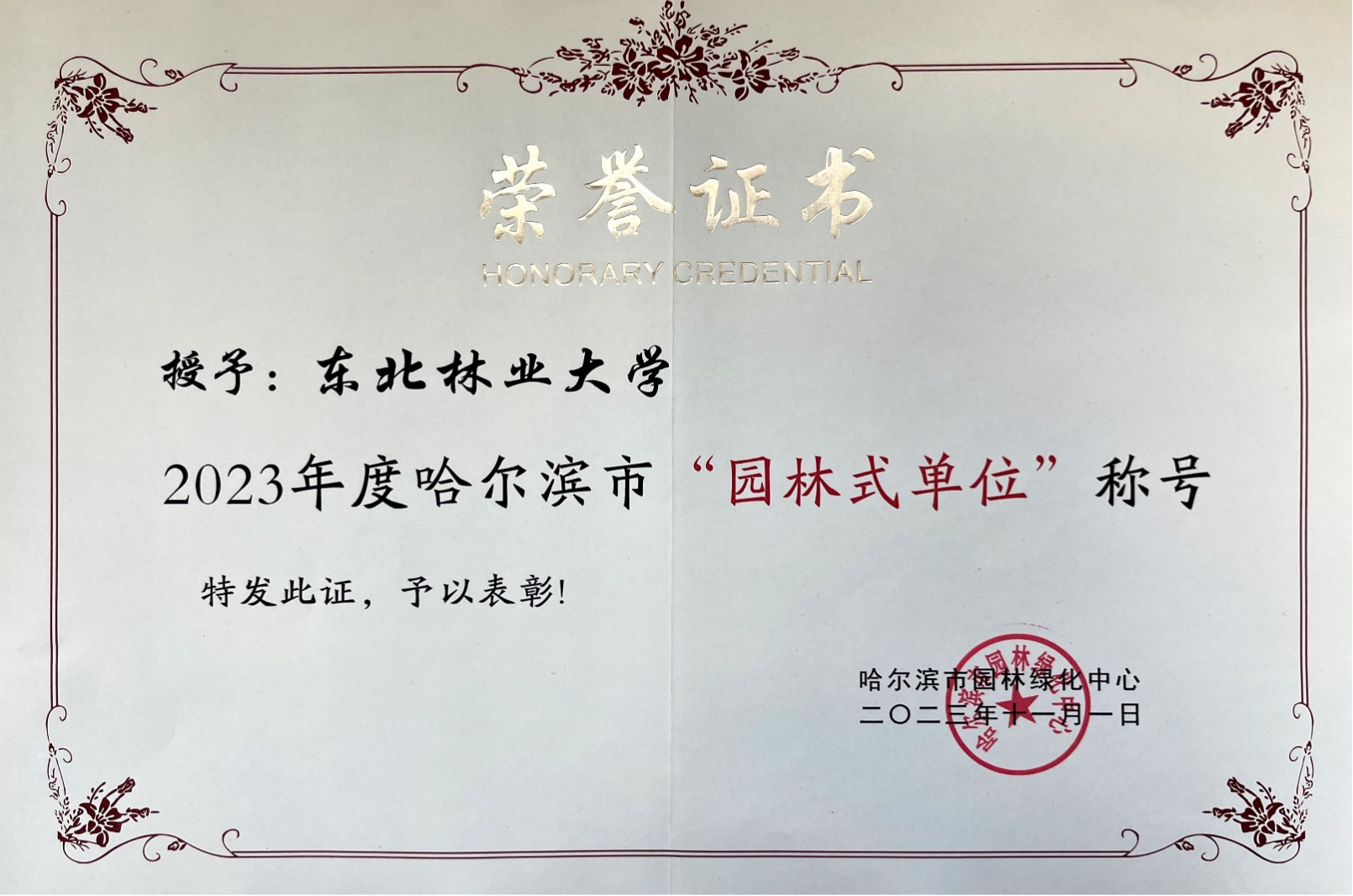 近日,由哈尔滨市园林绿化中心、各区园林绿化管理部门组织举办的2023年度“园林式庭院”、“园林式小区(家园)”评选结果揭晓,我校被授予“园林式单位”称号。