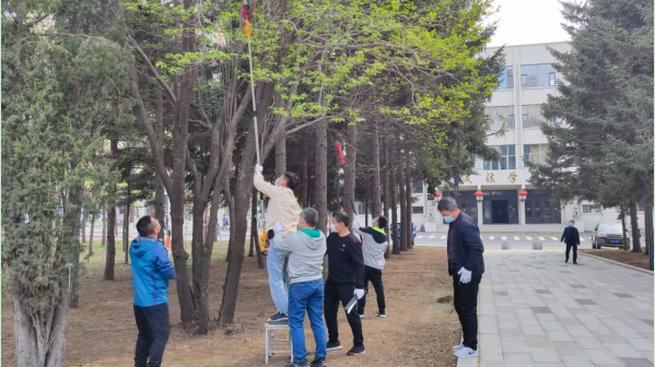 活动伊始,在校园建设处处长曲洪亮的带领下,党员同志们充分发扬“不怕苦、不嫌脏”的先锋模范作用,撸起袖子、拎起水桶、拿起板凳、扛起电锯,带着提前准备好的水盆、抹布等清扫工具,还有种类齐全的各种伐树修树设备,整装待发、气势昂扬地向着活动地点进发,为共建支部做好充分的后勤保障工作。