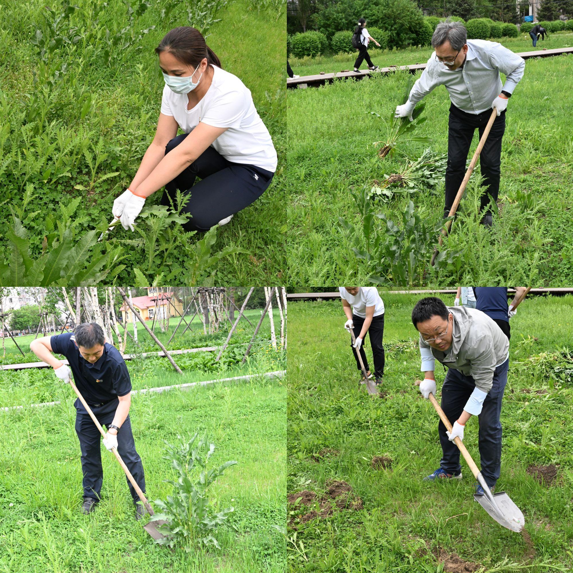 我校冰场栈道区域自然条件优渥,花草树木长势喜人,但是皱叶酸模和飞廉等杂草根部粗壮、叶片茂盛,不但影响周边草皮的生长,而且还影响冰场整体美观,如不根除,以后还会成为隐患。三个支部党员满怀热情来到冰场栈道,在绿化管护人员的简单指导后,纷纷拿起工具,开始除草工作,大家顶着烈日,将有碍美观的阔叶杂草进行彻底拔除,还校园清洁美丽。