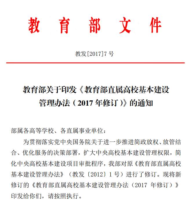 为贯彻落实党中央国务院关于进一步推进简政放权、放管结合、优化服务的决策部署,扩大中央高校基本建设管理权限,简化中央高校基本建设项目审批程序,我部对原《教育部直属高校基本建设管理办法》(教发〔2012〕1 号)进行了修订。现将新修订的《教育部直属高校基本建设管理办法(2017 年修订)》印发给你们,请按照执行。